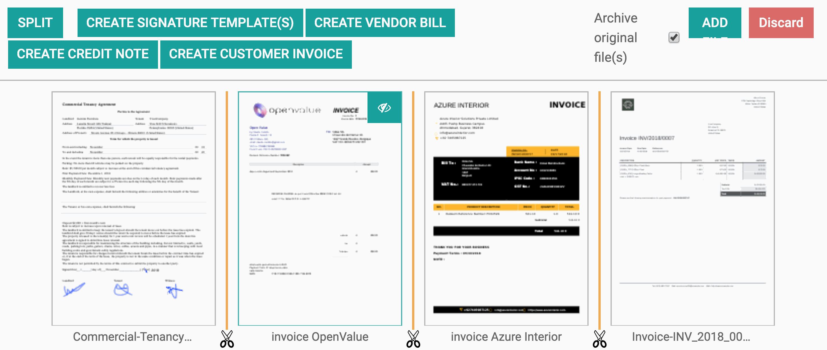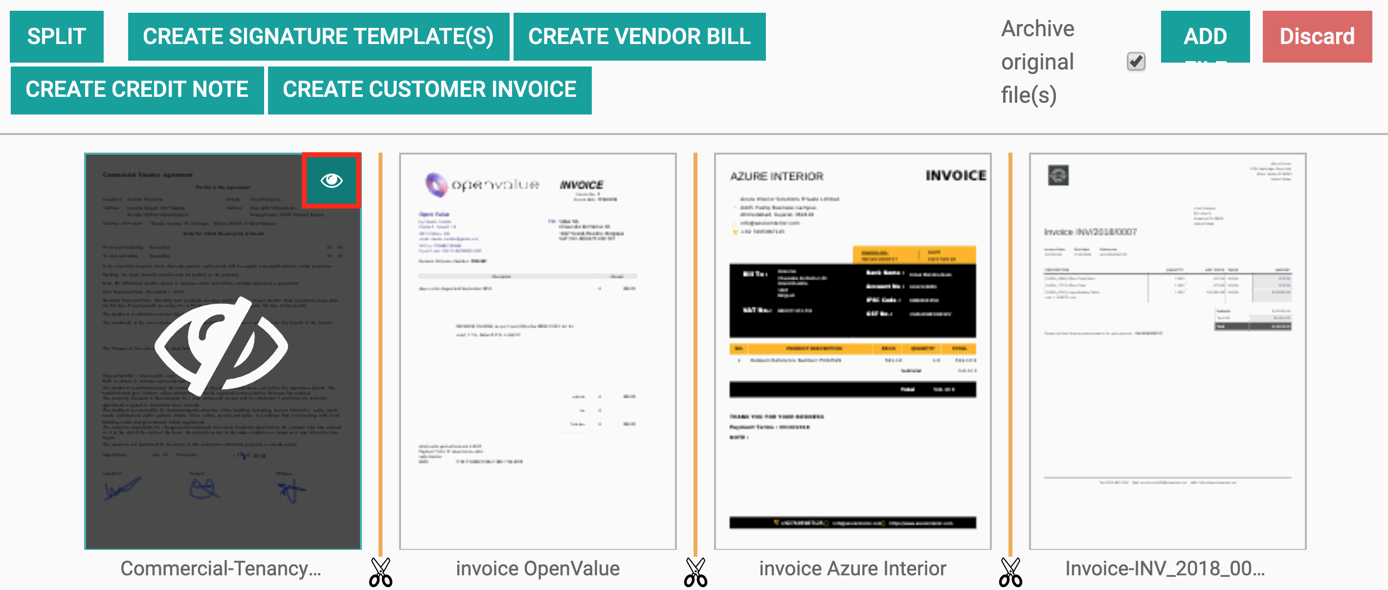 Đầu tiên, chúng tôi xử lý tất cả các hóa đơn của nhà cung cấp. Bắt đầu bằng cách nhấp vào biểu tượng chiếc kéo ở giữa các trang thuộc cùng một hóa đơn. Sau đó, ẩn các tài liệu không phải là hóa đơn của nhà cung cấp để chúng không bị xử lý.