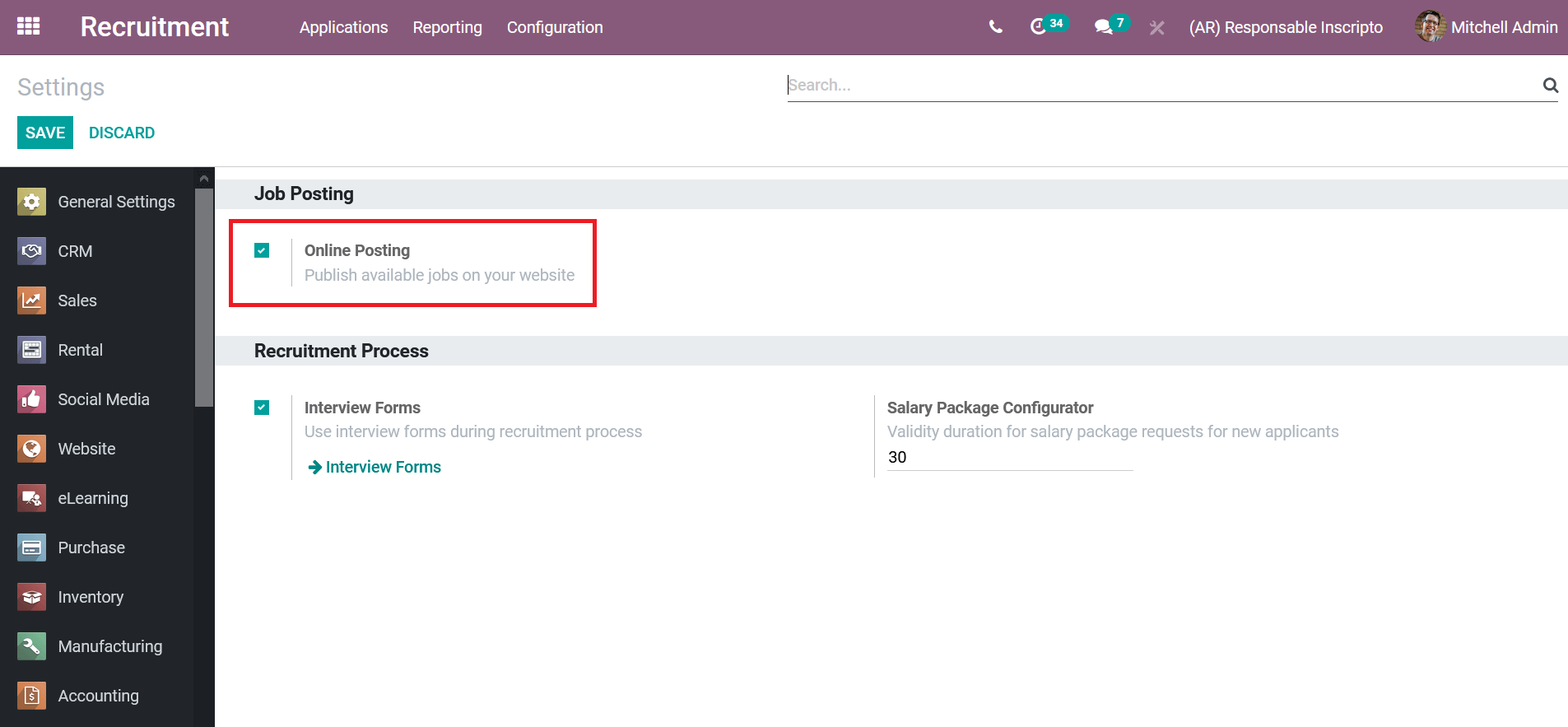 Với Odoo, bạn có thể tiến hành tuyển dụng nhân viên trực tuyến và quản lý toàn bộ quá trình tuyển dụng. Để tiến hành đăng tuyển dụng trực tuyến và thực hiện quy trình tuyển dụng, ban đầu bạn nên bật tùy chọn đăng tuyển trực tuyến có sẵn trong menu cài đặt của mô-đun tuyển dụng như được mô tả trong ảnh chụp màn hình sau và cuối cùng, lưu menu.