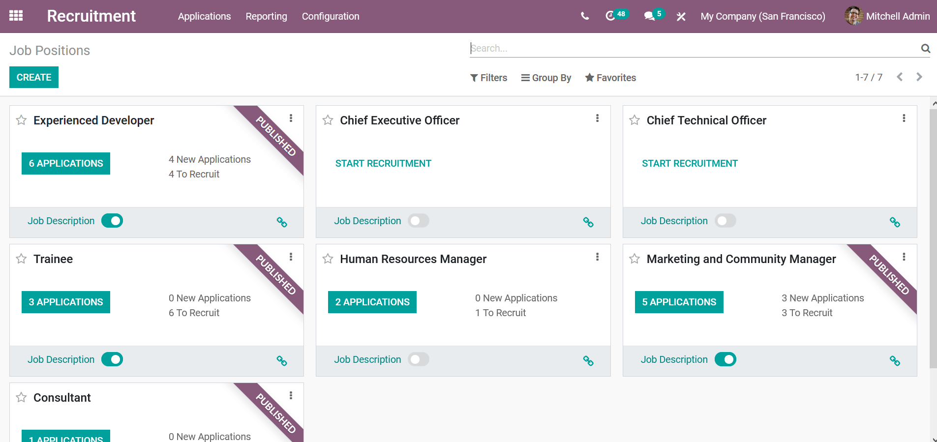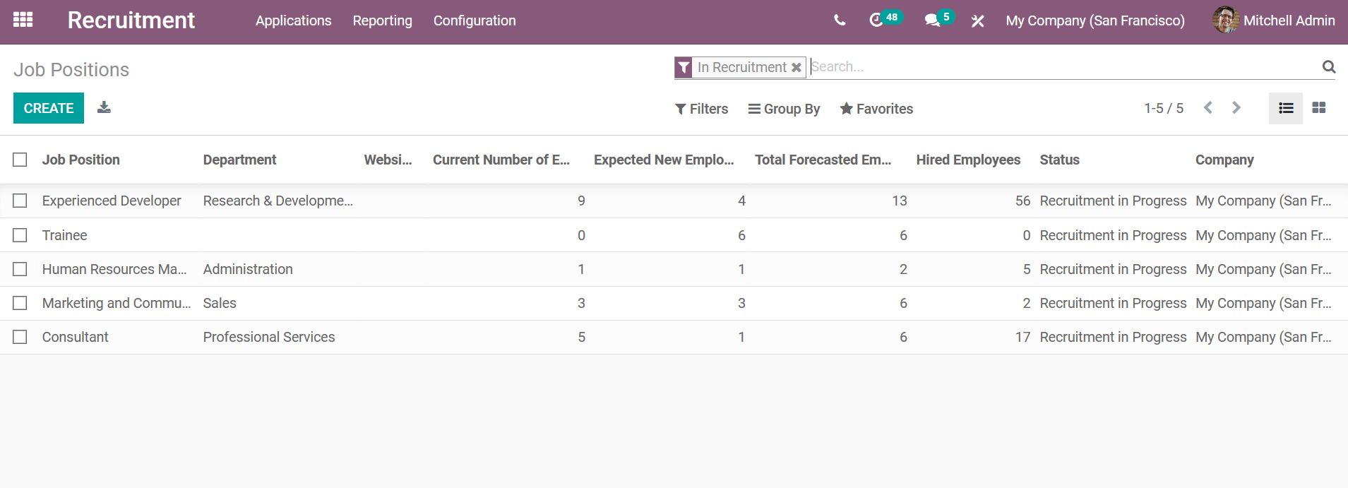 Tất cả các mục đích và hoạt động tuyển dụng đều được thực hiện trực tuyến bằng nền tảng Odoo bằng cách sử dụng các công cụ được cấu hình khác nhau và các tùy chọn chức năng có sẵn trong chính Odoo ERP.