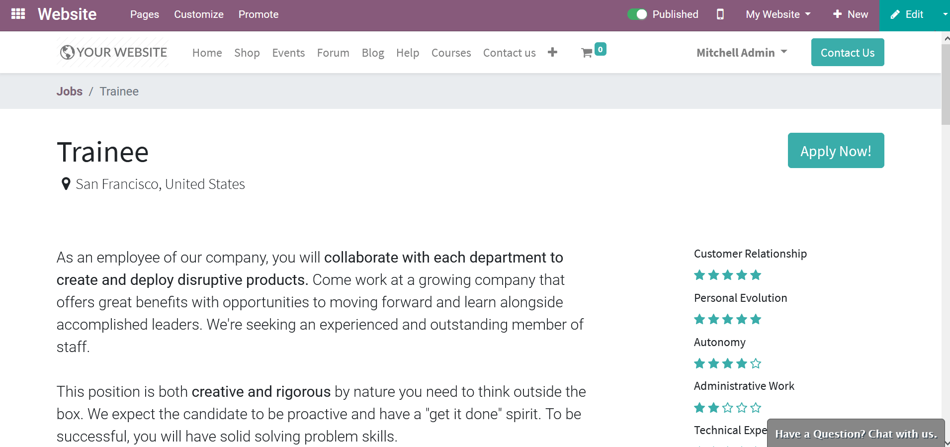 Sau khi lưu Tin tuyển dụng, bạn có thể xem công việc tương ứng đang được mô tả trên trang web của công ty. Trong cửa sổ Công việc như được mô tả trong hình ảnh sau đây. Trong trường hợp bạn chưa có trang Việc làm, bạn có thể tạo một trang mới bằng cách chọn tùy chọn mới có sẵn và chọn để tạo một trang. Và sau đó các tin tuyển dụng được mô tả ở phần cuối của nền tảng sẽ được tự động gán cho nó.