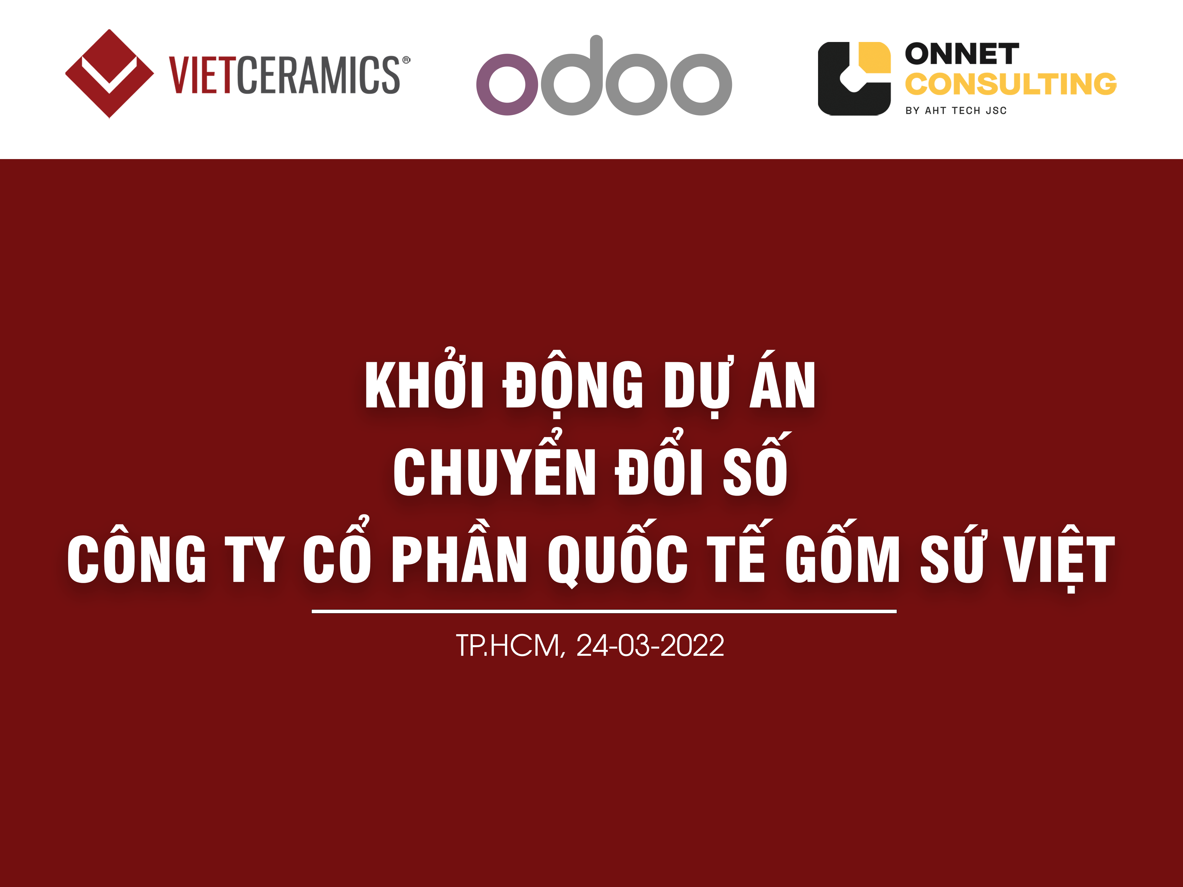 Ngày 25/3/2022 tại trụ sở của công ty, đại diện Công Ty Cổ phần Quốc Tế Gốm Sứ Việt (Vietceramics) và đội dự án Onnet Consulting đã cùng tham gia buổi lễ "Khởi động dự án chuyển đổi số toàn diện trên nền tảng Odoo".