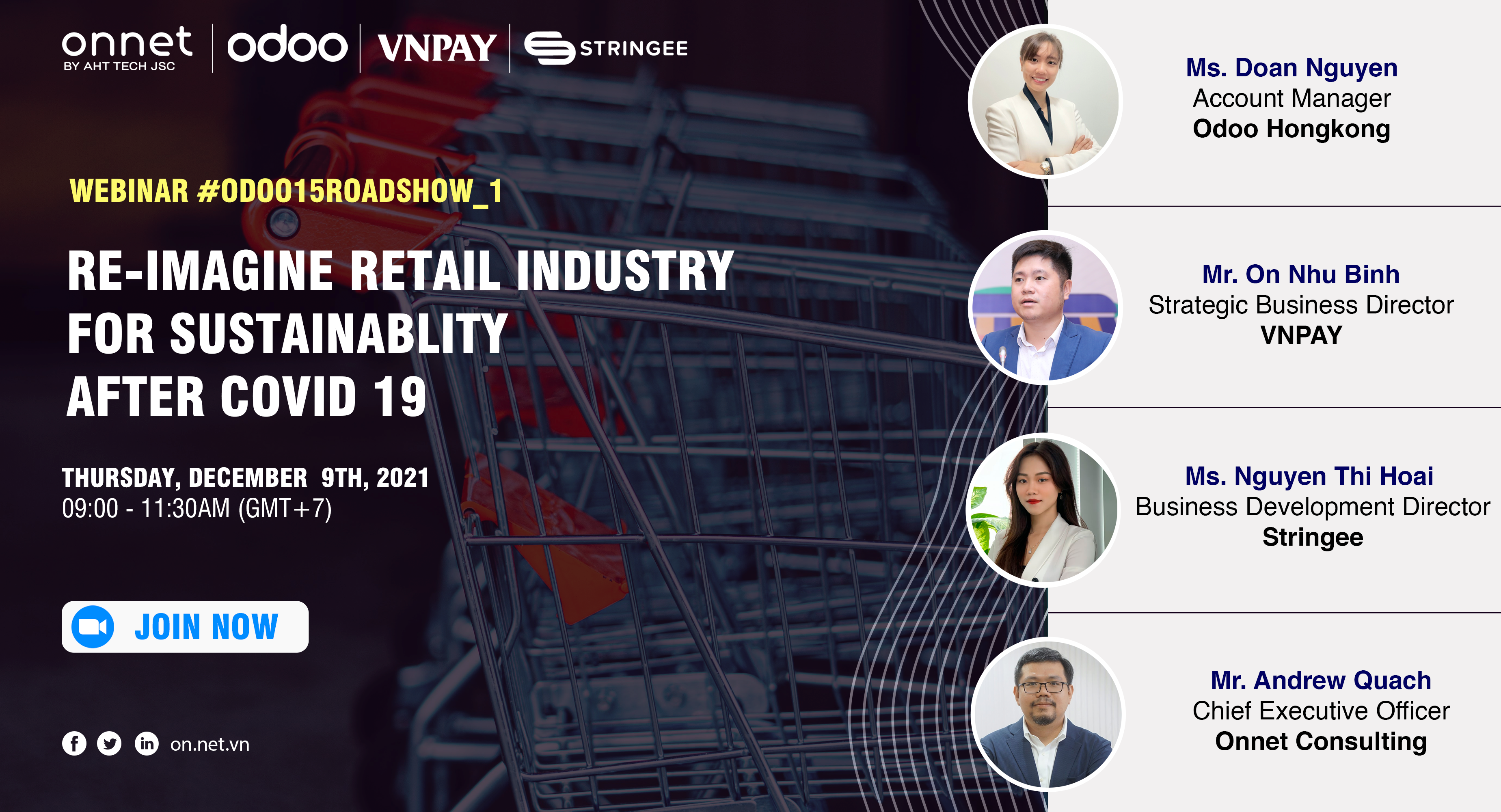 Webinar này do Onnet Consulting đồng tổ chức cùng Odoo, VNPAY và Stringee. Chúng ta sẽ được nghe chia sẻ từ các chuyên gia giàu kinh nghiệm về các giải pháp chuyển đổi số, thanh toán và chăm sóc khách hàng hàng đầu tại Việt Nam. Từ đó các doanh nghiệp bán lẻ sẽ biết được mình cần làm gì để phát triển bền vững trong giai đoạn bình thường mới hậu Covid -19.