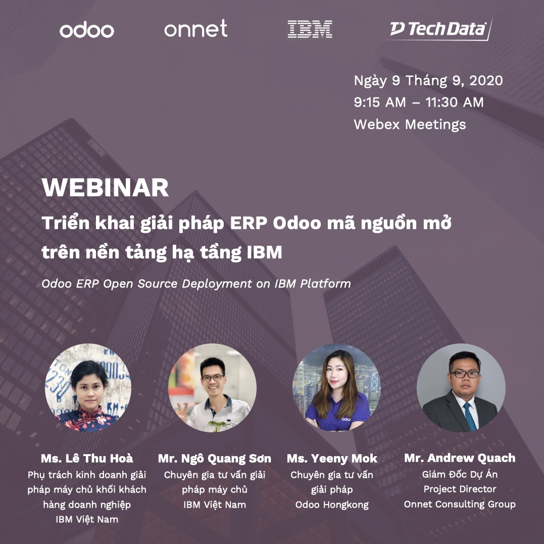 Sự kiện "Triển khai giải pháp ERP Odoo mã nguồn mở" do Onnet Consulting Group tổ chức, với sự phối hợp của IBM Việt Nam và Odoo  sẽ giúp bạn khám phá những ưu điểm của Odoo ERP Open Source, những tính năng vượt trội của máy chủ, lưu trữ IBM và Dịch vụ triển khai trọn gói phần mềm quản trị doanh nghiệp Odoo trên hạ tầng IBM.